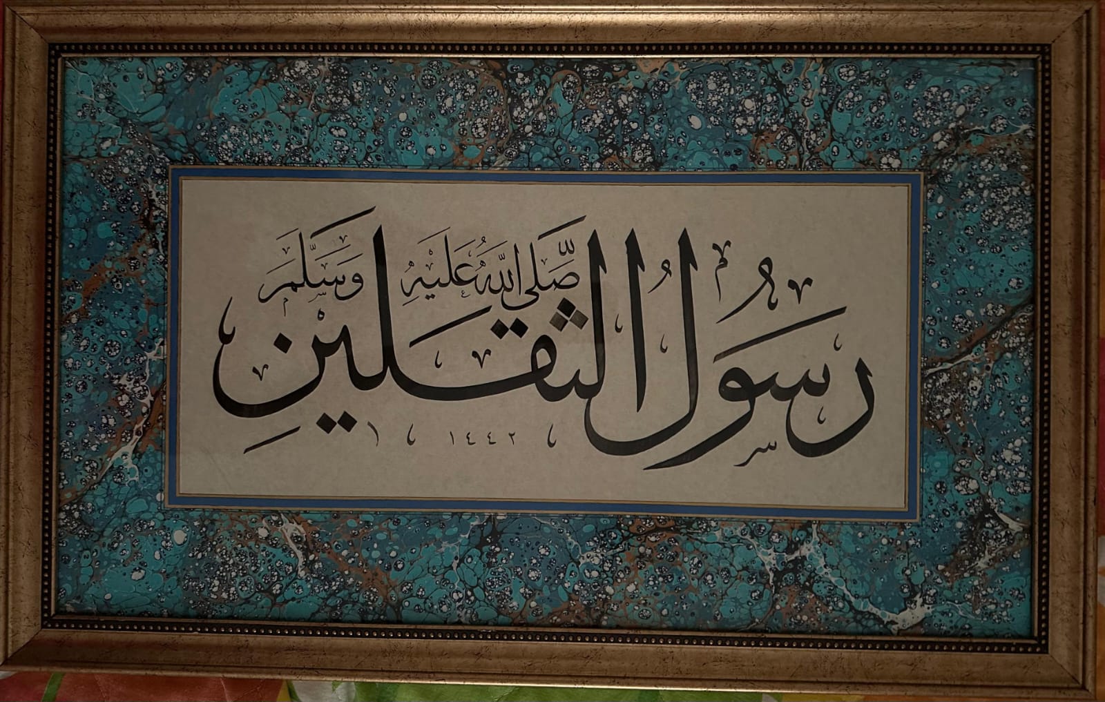Peygamber Efendimiz (s.a.v.) için insanların ve cinlerin peygamberi anlamında “resûlü’s-sekaleyn” ifadesi hat sanatında istif formatında yazılmıştır.